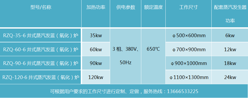 蒸汽發藍(氧化)爐 此設備可根據用戶要求進行定制、定做,服務熱線:13666533225 井式蒸汽發藍(氧化)爐是節能型高精度控溫周期作業爐,主要適用于34CrMoV4孔鋸、粉末冶金制品、汽車鑄鐵排氣管、高速鋼工具、模具、硅鋼片、電機轉子、定子熱作模具等表面絕緣和防銹的蒸氣處理之用,處理后耐磨性、絕緣性良好,是當代先進的熱處理設備。也可用于產品的少氧化的回火熱處理。 工件在500℃以上高溫熱空氣及過熱蒸氣中進行氧化反應,在金屬表面形成一層氧化膜(Fe3O4),具有非常致密且很薄的結構,因氧化膜是在金屬本身的表面形成的,所以有非常高的附著力及絕緣性能,因氧化膜本身有較高的性能及耐腐蝕性,在微特電機上可替代烤漆處理