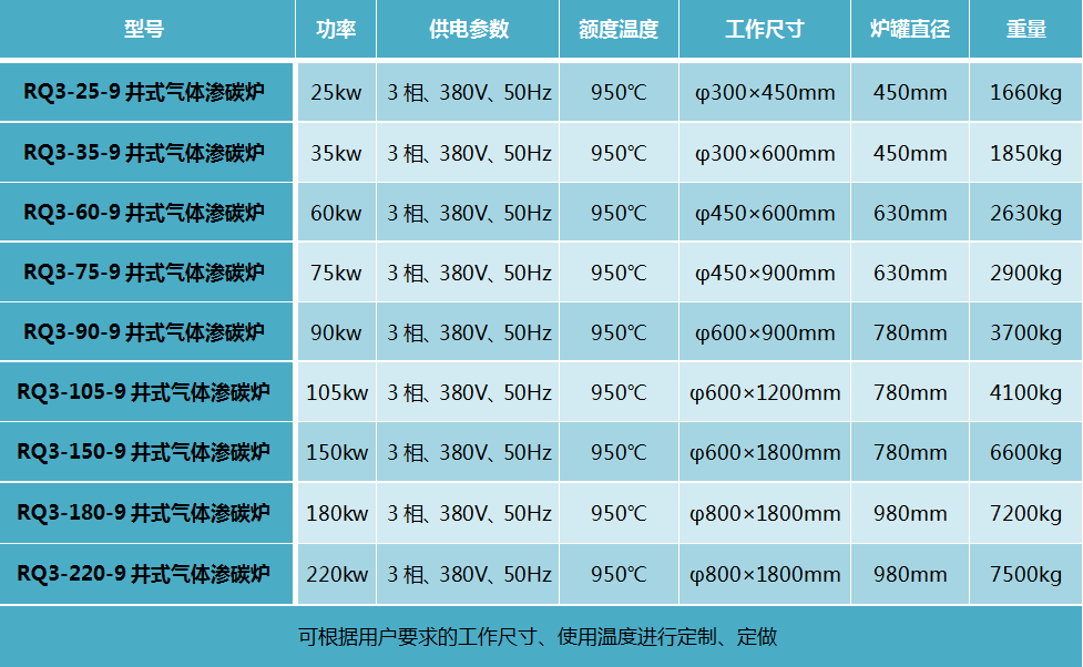 井式氣體滲碳爐 此設備可根據用戶要求進行定制、定做,服務熱線:13666533225 RQ3系列井式氣體滲碳爐(以下簡稱電爐)系周期作業式電爐,主要供碳鋼機件的氣體滲碳等用。與電爐控制柜配合使用可自動控制及自動記錄電爐的溫度。 一、開爐前準備工作 1、清除爐罐內的碳黑,檢查密封襯墊。 2、檢查循環風扇、電動機,給軸承加潤滑脂、冷卻水套通水。 3、檢查熱電偶位置及油壓提升機構。 4、檢查滴定器、甲醇、煤油儲存器。 二、開爐操作規程 1、合上電源開關。 2、調整儀表自動控制裝置正常后才允許通電升溫。 3、升溫時,開動風扇。 4、爐溫升到850℃時,開始滴入煤油(或甲醇)。 5、爐溫到需要溫度后,切斷爐子和風扇的電源,才能裝進工件。然后關緊爐門,接通風扇和爐子電源,按范圍操作。 6、工件出爐后,關緊爐蓋,繼續未動風扇,切斷爐子電阻絲電源,滴入少量煤油。 7、爐溫降至850℃時,停止滴入煤油。 8、爐溫降至600℃時,停止風扇,切斷電源開關。
